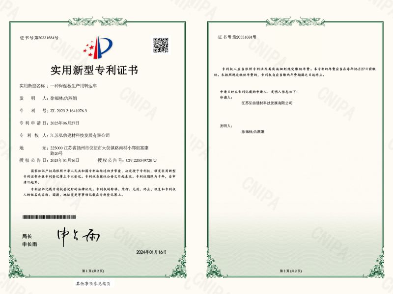 實用新型證書_一種保溫板生產(chǎn)用轉(zhuǎn)運車
